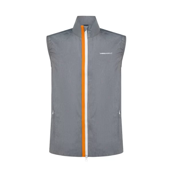 Stay ready for changing weather with the Aguila Lightweight Performance Golf Vest. Designed in sleek gray with a striking orange zipper accent, this vest balances style and utility. Crafted from wind-resistant, lightweight fabric, it provides optimal comfort and freedom of movement. The sleeveless design ensures unrestricted swings, while the high collar offers added protection against the elements. Perfect for layering during early morning or breezy rounds.